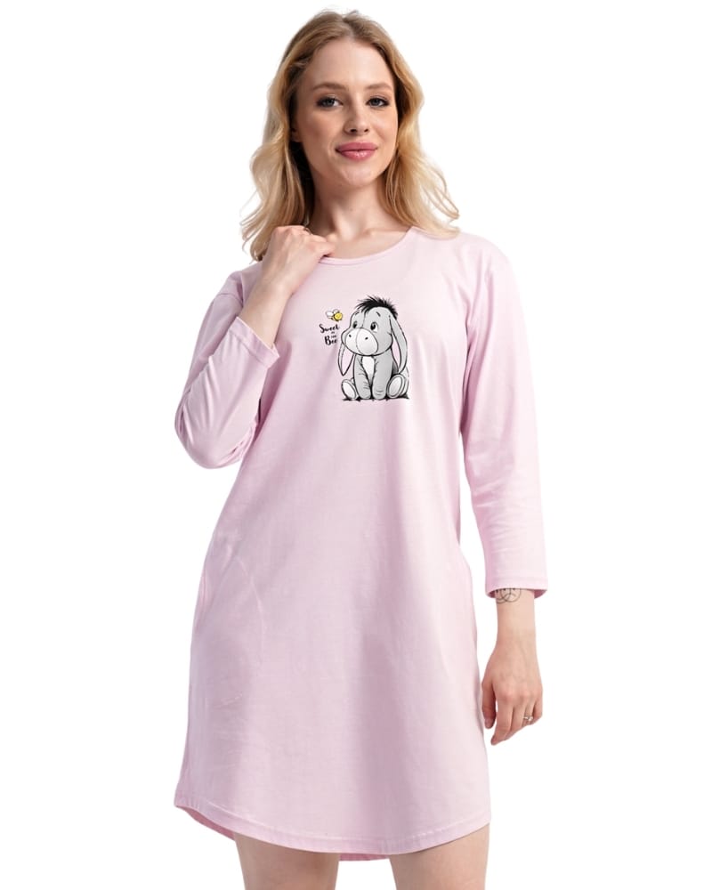 Domácí bavlněné šaty s kulatým výstřihem mají praktické kapsy a zdobí je na hrudi obrázek oslíka.
