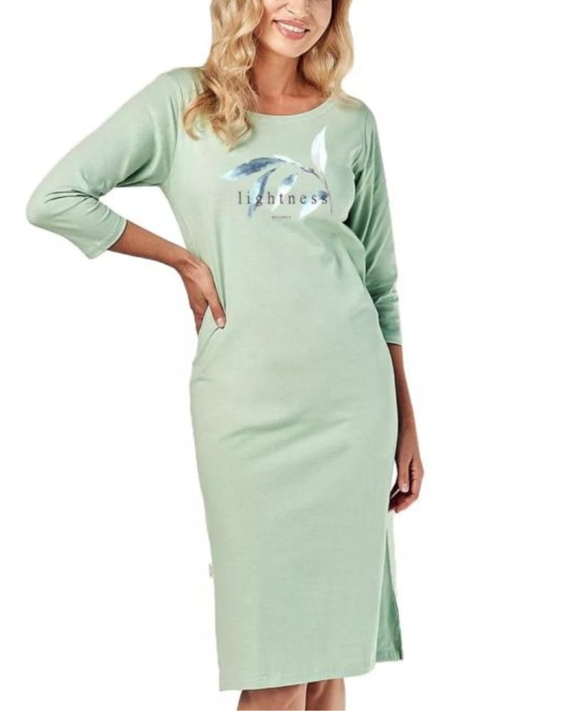 Dámská noční košile Olympia 2996/31 TARO v světle zelené barvě přináší pohodlí a styl během spaní. Košile je zdobená motivem listů a nápisem „lightness BALANCE“, který dodává jemný a moderní vzhled. Pro výrobu byla použita 100% bavlna, která je známá svou měkkostí a prodyšností. Tento materiál zajišťuje příjemný pocit na pokožce a ideální komfort během celého noci. Noční košile má tříčtvrteční rukávy a kulatý výstřih, což ji činí vhodnou volbou pro chladnější noci i pro ty, kdo preferují lehčí pokryt…