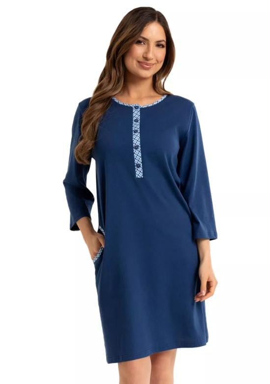 Dámská noční košile 165/52 značky REGINA přináší spojení elegance a pohodlí, které oceníte při každém večeru. Hluboký námořnický odstín působí sofistikovaně, zatímco jemný materiál zaručuje příjemný pocit na pokožce. Volnější střih s dlouhými rukávy poskytuje volnost pohybu i potřebnou vzdušnost pro klidné noci. kulatý výstřih s kontrastním lemem a decentní knoflíkovou légou dodává modelu osobitost.