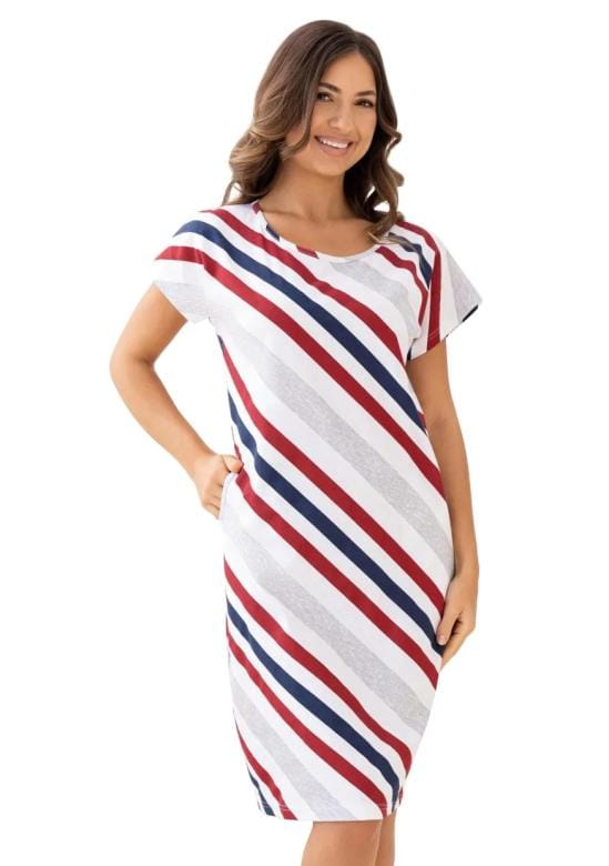 Dámská noční košile 175/62 značky REGINA představuje ideální volbu pro ženy, které hledají pohodlí a styl v jednom. Volný střih s krátkými rukávy zajišťuje maximální komfort během celého večera i noci. Měkký materiál ze 100% bavlny je příjemný na dotek a umožňuje pokožce dýchat, což oceníte zejména v teplejších měsících. Výrazné diagonální pruhy v kombinaci bílé, červené a tmavě modré barvy vytvářejí moderní vzhled, který osvěží Váš domácí šatník. Kulatý výstřih usnadňuje oblékání a dodává košili elegant…