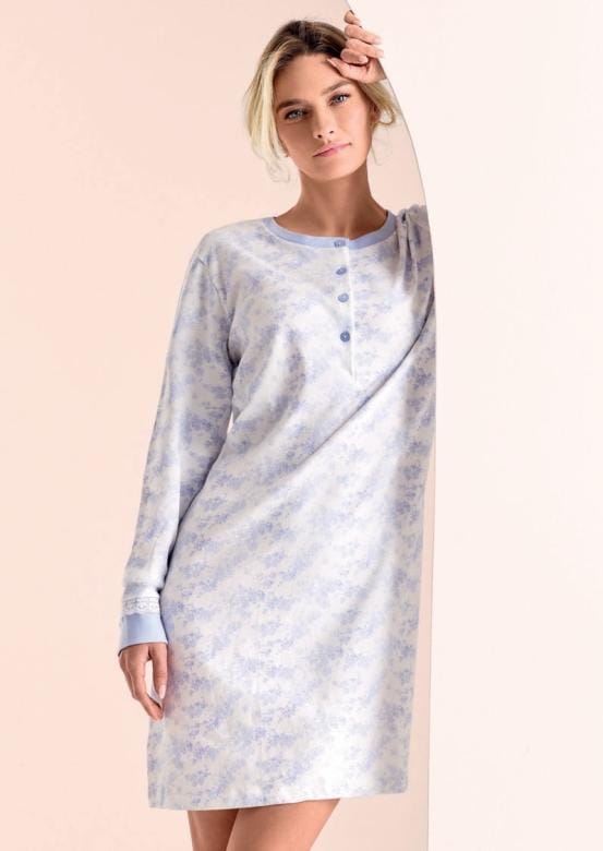 Dámská noční košile Infiore v jemném světle modrém odstínu nabízí pohodlí i elegantní vzhled. Je ušitá z měkkého, příjemného materiálu, který se krásně nosí po celou noc. Košile má dlouhé rukávy, kulatý výstřih s kontrastním lemem a ozdobnou légou se čtyřmi knoflíčky. Jemný květinový potisk působí velmi něžně a rukávy doplňuje decentní krajka. Ideální volba pro ženy, které hledají kombinaci komfortu a ženského stylu.