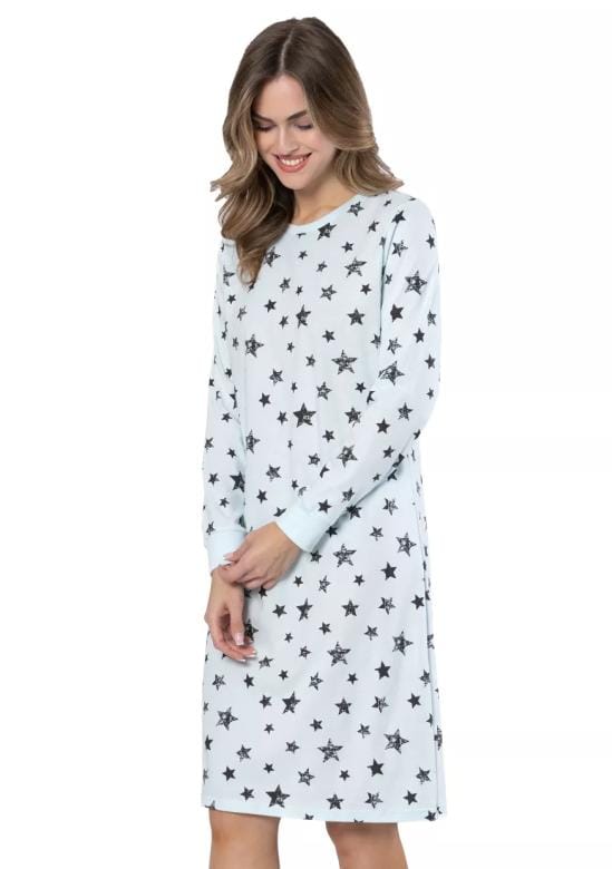 Dámská noční košile Klara 1644 značky LEVEZA je volbou pro ženy, které hledají spojení elegance a pohodlí v každém detailu. Lehký materiál s výrazným hvězdným vzorem působí svěže a přirozeně, zatímco klasický střih se postará o maximální komfort během celého večera i noci. Dlouhé rukávy chrání před chladem, kulatý výstřih zajišťuje příjemné nošení bez rušivých prvků a čisté linie podtrhují decentní vzhled.