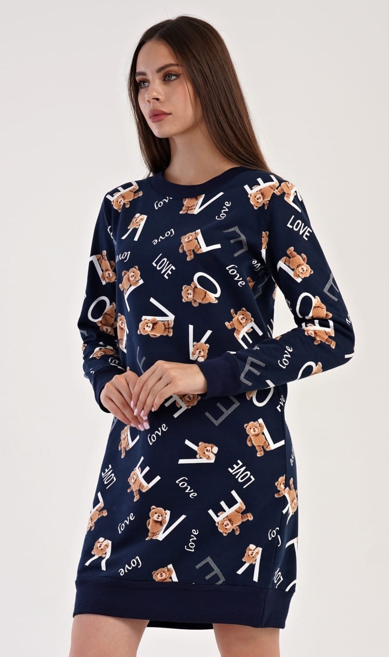 Dámská bavlněná noční košile s dlouhým rukávem Méďa. Silnější oteplený materiál je potištěný obrázky pyšových medvídků a nápisy LOVE. Rukávy a spodní lem jsou zakončeny pantem. Košile je vhodná i na denní nošení jako domácí šaty. Doplněnou o legíny ji oceníte v chladnějších dnech.