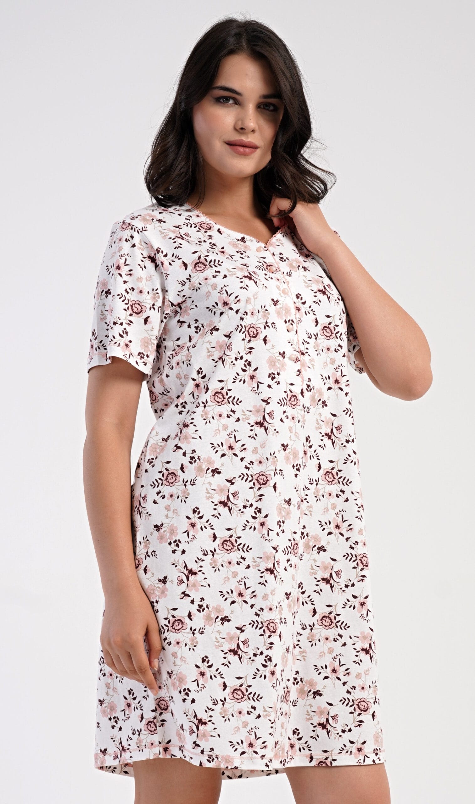 dámská bavlněná noční košile s krátkým rukávem Růže. Dámská noční košile má příjemnou délkou po kolena a delší légu s pěti knoflíky. Košile s krátkým rukávem je potištěna  růžemi v lososové barvě. Použitý materiál s podílem bavlny 100% je příjemný a poddajný na dotek. Pokyny pro údržbu:- 100% bavlna- lze prát v pračce při teplotě do 30°- nesušit v sušičce- žehlit z rubu do 110°- nepoužívat bělící prostředky- nečistit chemickyMíry naměřené na výrobku: 5031510060 Růže1XL2XL3XL4XLobvod hrudníku124126130134o…