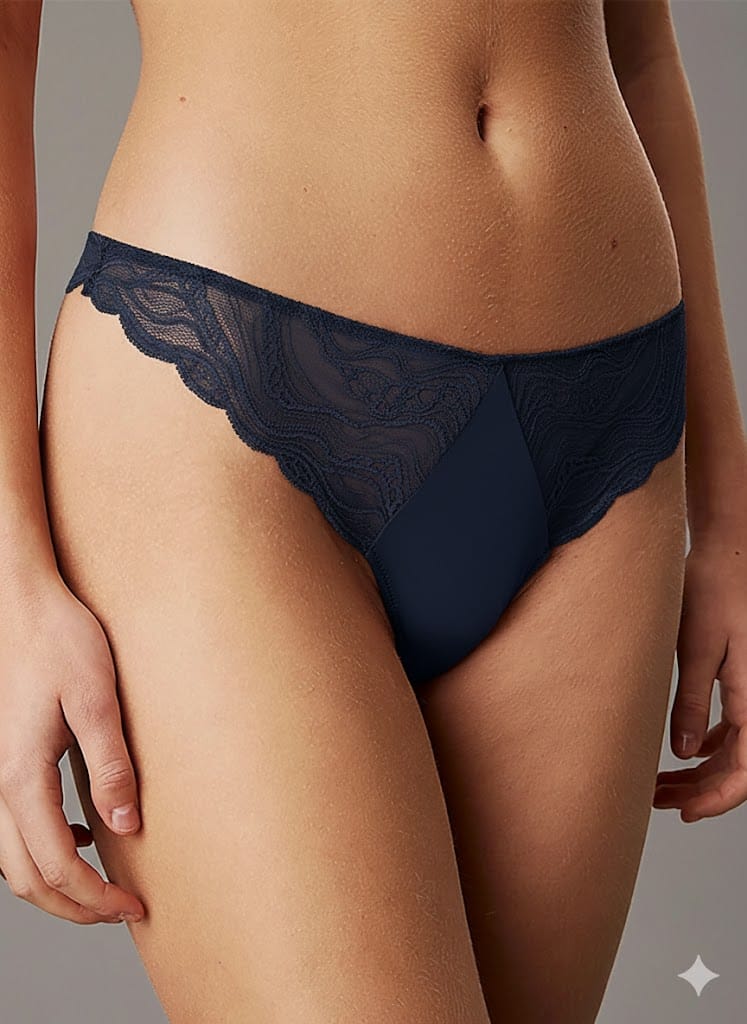 Tanga jsou vpředu uprostřed z hladké látky a po bocích efektně střižená krajka, která pokračuje dozadu v pase.