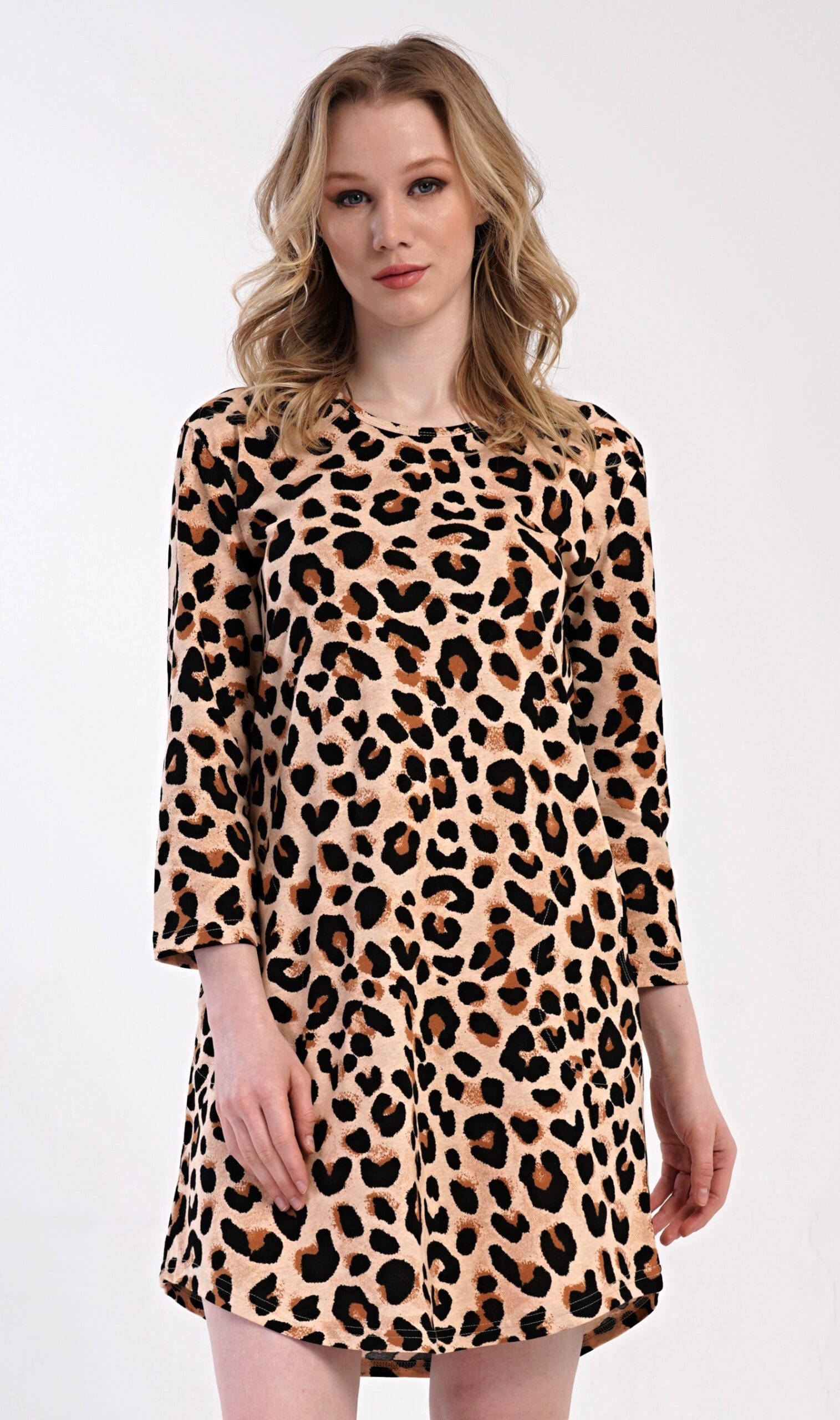 Dámské bavlněné domácí šaty s tříčtvrtečním rukávem Leona. Domácí bavlněné šaty s kulatým výstřihem a kapsami zdobí obrázky leopardí potisk. Použitý bavlněný materiál je příjemný a poddajný na dotek. Pohodlné domácí šaty jsou vhodné také na spaní.