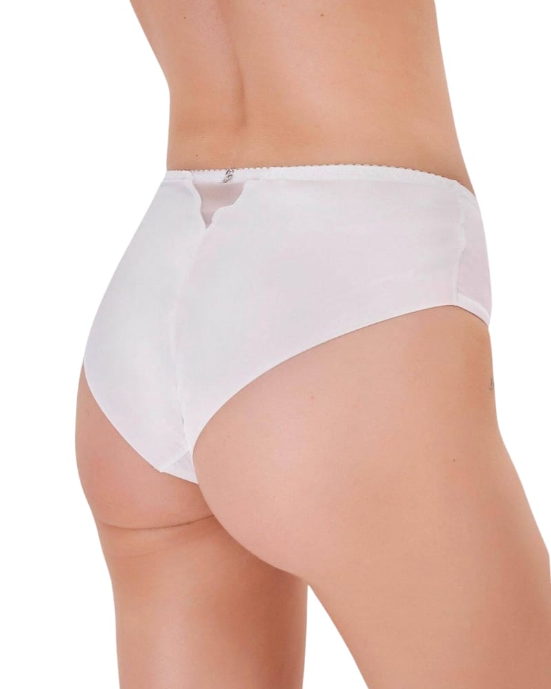Dámské kalhotky jsou hladké a vzadu mají menší tylovou vsadku v pase tvaru trojúhelníku.