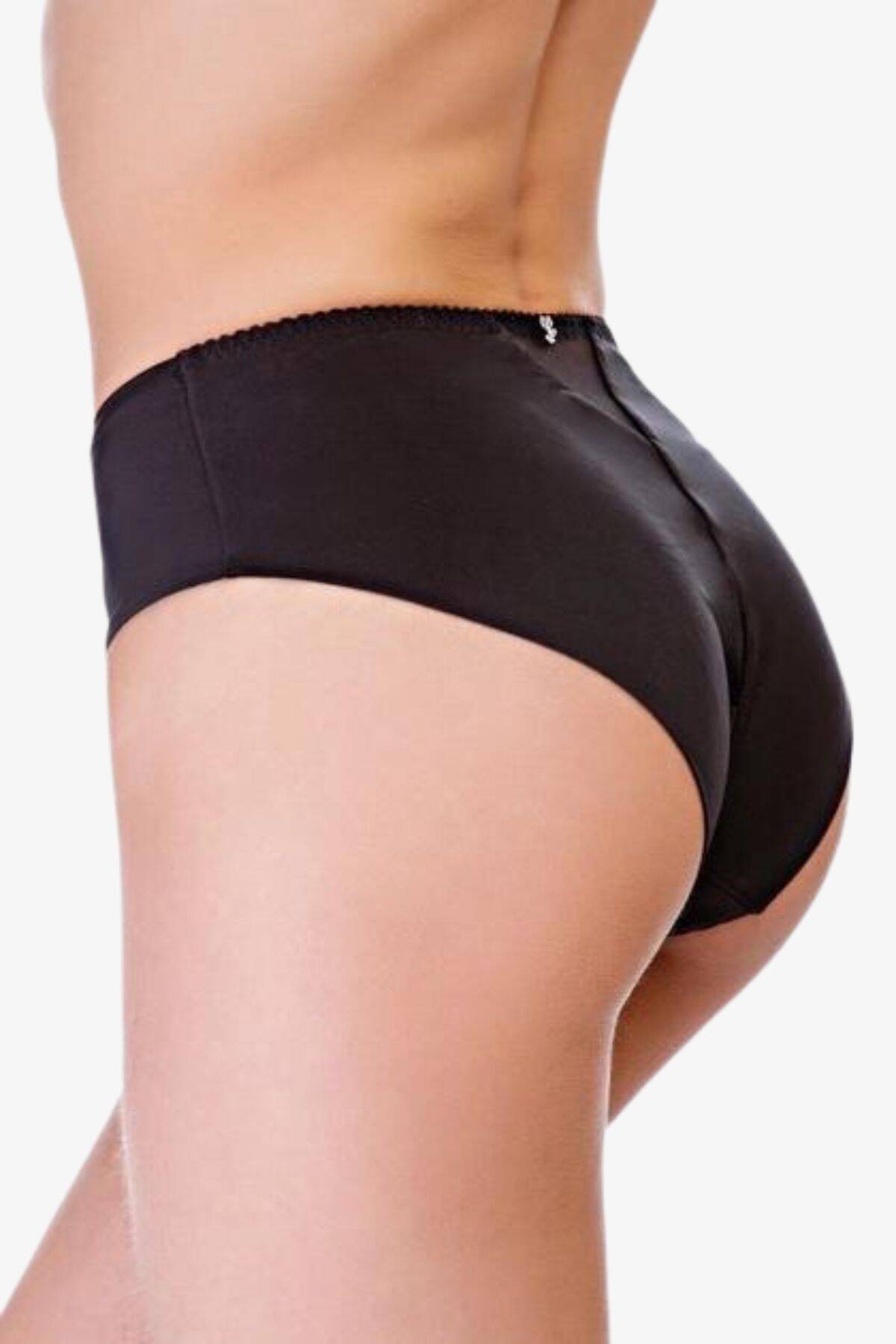 Dámské kalhotky jsou hladké a vzadu mají menší tylovou vsadku v pase tvaru trojúhelníku.