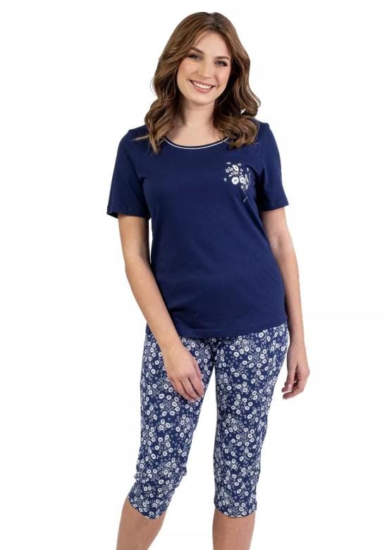 Tento model nabízí kulatý výstřih s barevným lemem, který působí svěže a decentně. Krátký rukáv je vhodný pro teplejší období a zajišťuje svobodu pohybu. Potisk drobných květin přidává celému pyžamu jemný a ženský vzhled. Capri kalhoty bez kapes poskytují dostatek pohodlí a zároveň nepřekáží během odpočinku. Materiál: Vyrobeno ze 100% bavlny, která je příjemná na dotek a umožňuje pokožce dýchat.