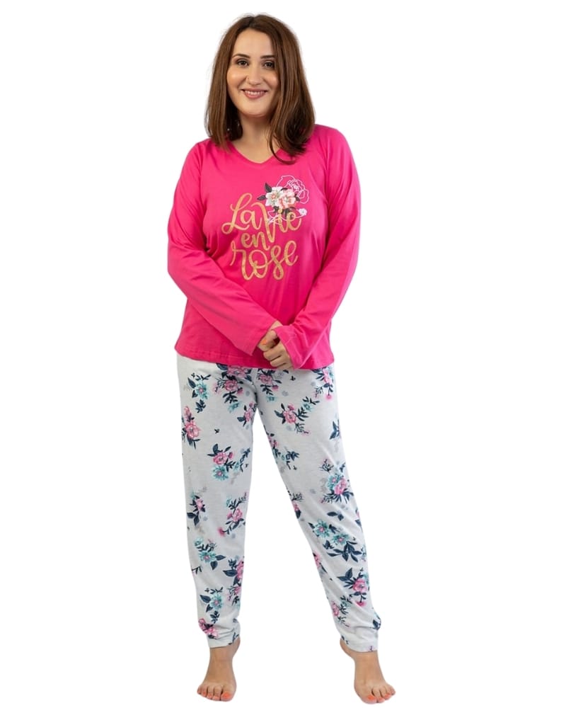 Dámské pyžamo má dlouhé rukávy a motiv květiny, kalhoty jsou rovněž dlouhé s potiskem.
