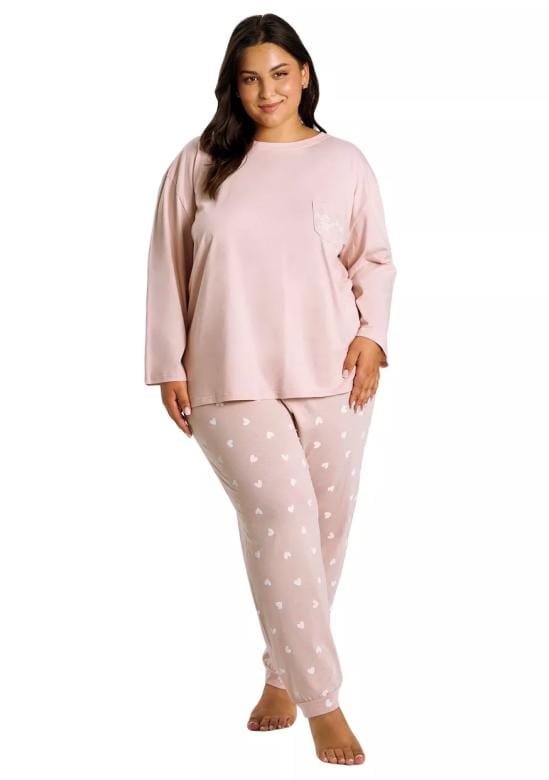 Dámské nadměrné pyžamo Nori 3468 značky TARO přináší spojení elegance a pohodlí, které si zaslouží každá žena. Tento dvoudílný set v jemném pastelově růžovém odstínu je navržen pro chvíle klidu i odpočinku. Vrchní díl s dlouhými rukávy a kulatým výstřihem nabízí uvolněný střih a decentní krajkový detail, který podtrhuje ženskost. Praktická kapsička na hrudi dodává pyžamu ležérní nádech. Spodní díl tvoří dlouhé kalhoty s elastickým pasem a hravým vzorem bílých srdíček, díky kterému se budete cítit příjemn…