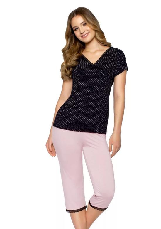 Dámské pyžamo Cleo BABELLA představuje pohodlnou volbu pro každou ženu, která ocení kvalitu i styl. Tričko pyžama je černé s jemným vzorem drobných teček a zdobí ho něžná krajka ve výstřihu, která dodává elegantní nádech. K růžovým capri kalhotám bez kapes je použit volný pružný pás pro maximální komfort během spánku či odpočinku. Pyžamo je vyrobeno z příjemné a měkké viskózy, která zaručuje pohodlné nošení i během teplejších nocí.Typ: Capri kalhotyStyl: Vzorem teček, krajkové detailyVýstřih: V-čkový s k…