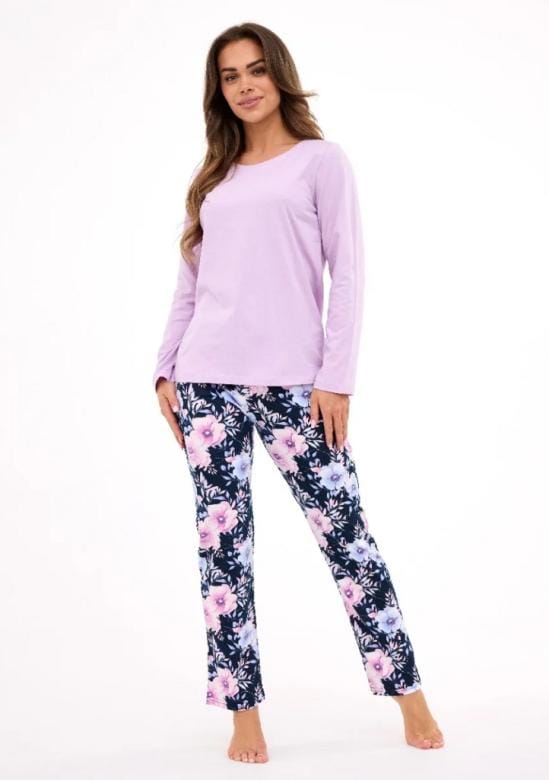 dámské pyžamo ve dvoudílné soupravě s hladkým, jednobarevným tričkem s dlouhým rukávem a kulatým výstřihem. kalhoty jsou dlouhé s jemným květinovým vzorem. Pyžamo je ušité z měkké a prodyšné bavlny, ideální pro pohodlný spánek i domácí nošení. Kalhoty jsou v pase do pružné obšité gumy pro větší komfort. Pyžamo je zabalené do krabičky, které může být i hezkým dárkem. Materiálové složení: 100% bavlna