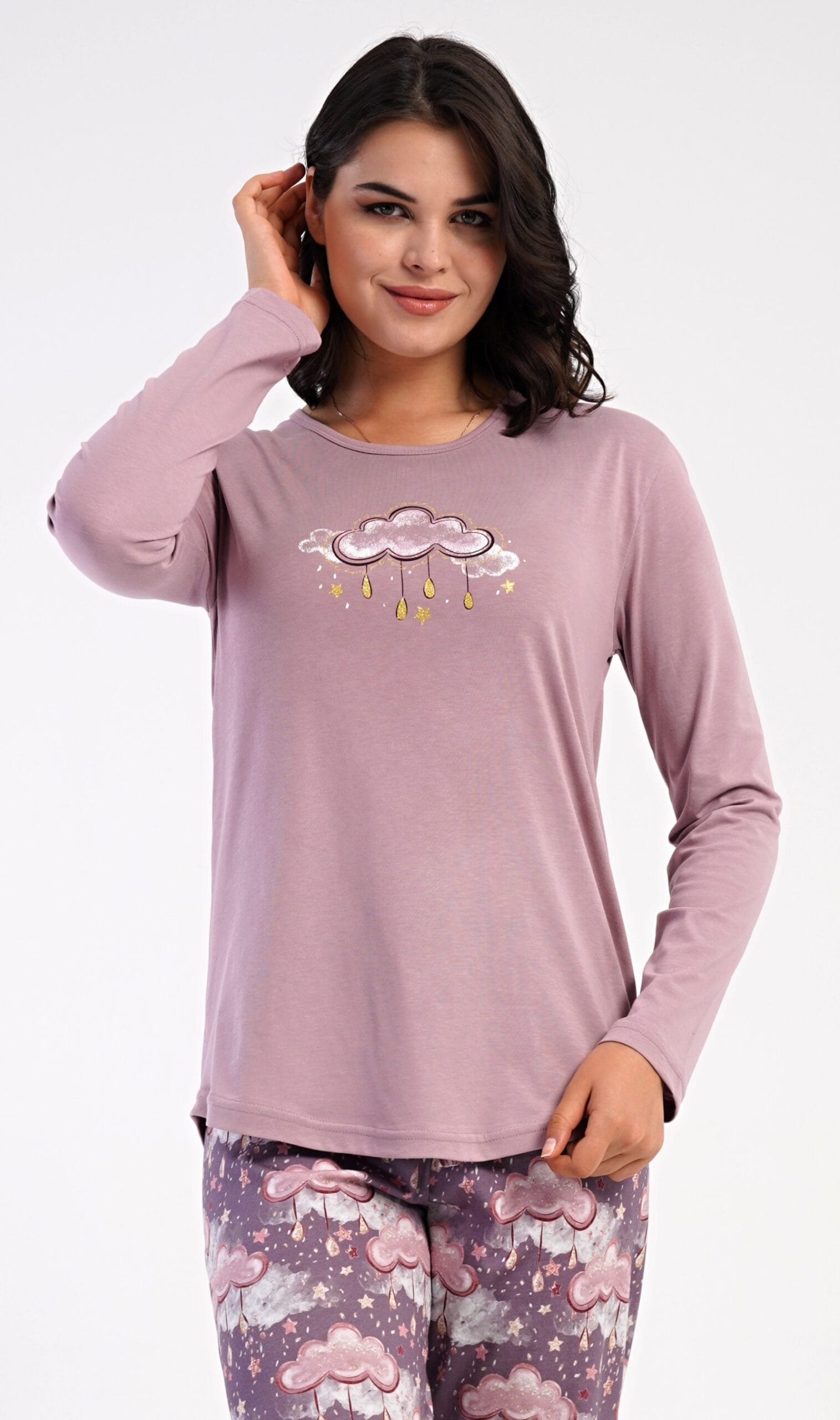 dámské bavlněné dlouhé pyžamo Amelia. Dámské pyžamo se skládá z trika s dlouhým rukávem a dlouhých kalhot. Jednobarevné triko s kulatým výstřihem zdobí obrázek obláčku. Tento motiv se opakuje i na kalhotách, které mají v pase gumu a šňůrku na stažení, nemají kapsy. Použitý bavlněný materiál je poddajný a příjemný na dotek. Pokyny pro údržbu:-100 % bavlna- lze prát v pračce při teplotě do 30°- nesušit v sušičce- žehlit z rubu do 110°- nepoužívat bělící prostředky- nečistit chemickyMíry naměřené na výrobku…