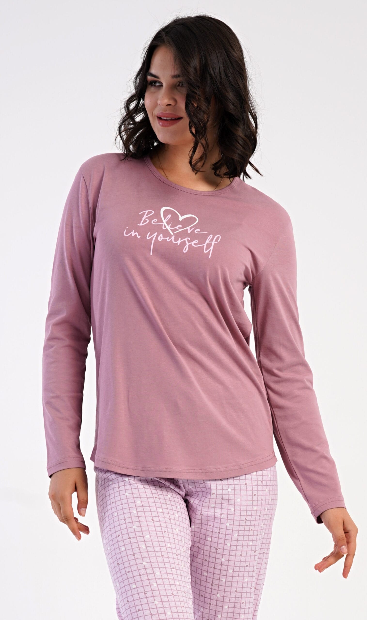 dámské bavlněné dlouhé pyžamo Believe. Dámské pyžamo se skládá z trika s dlouhým rukávem a dlouhých kalhot. Jednobarevné triko je ozdobeno motivačním nápisem. kalhoty potištěné srdíčky mají v pase gumu a šňůrku na stažení, nemají kapsy. Použitý bavlněný materiál je poddajný a příjemný na dotek. Pokyny pro údržbu:- 100% bavlna- lze prát v pračce při teplotě do 30°- nesušit v sušičce- žehlit z rubu do 110°- nepoužívat bělící prostředky- nečistit chemickyMíry naměřené na výrobku 5031072054 BelieveSMLXLobvod…