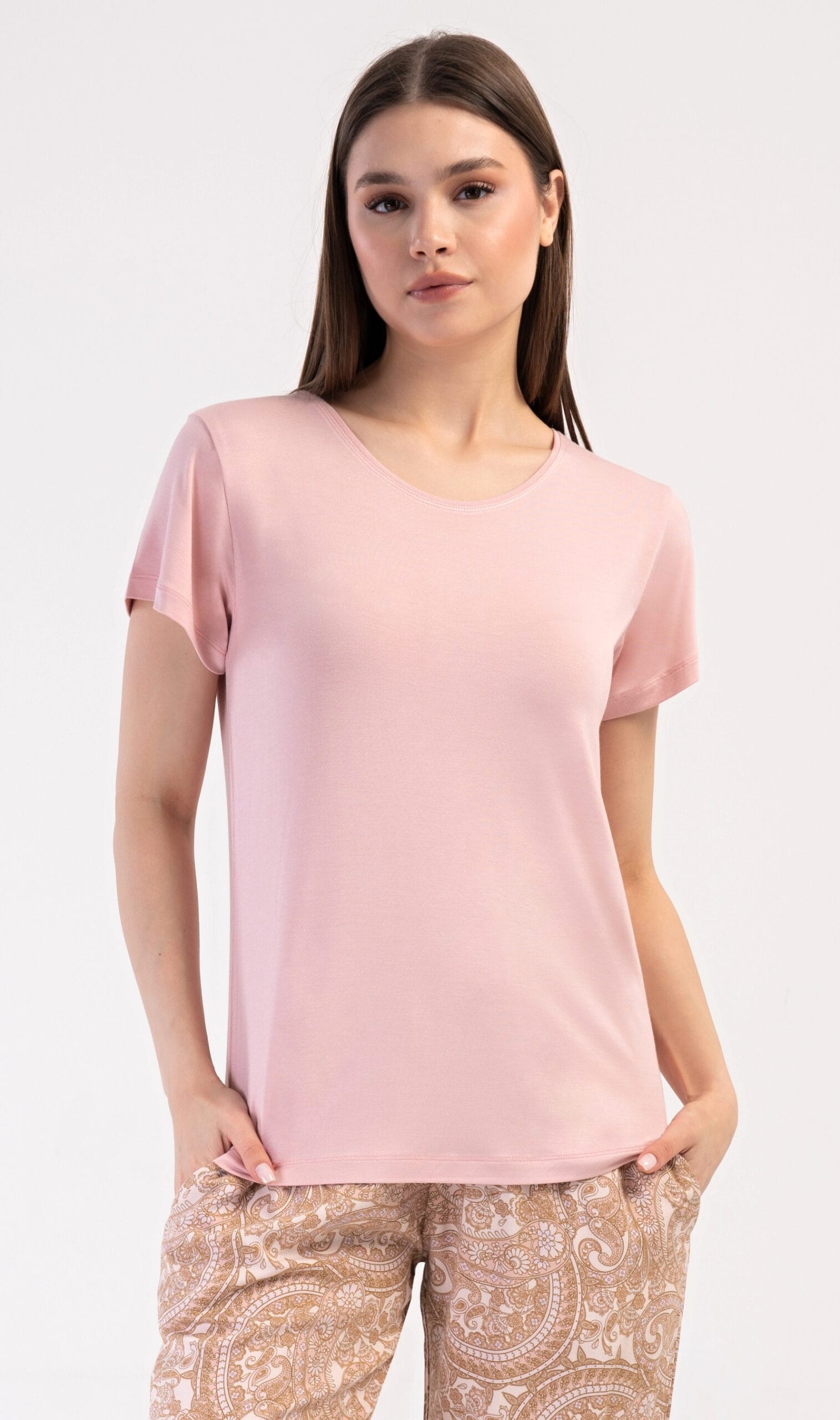 Dámské pyžamo s krátkým rukávem Olga. Dámské pyžamo se skládá z trika s krátkým rukávem a dlouhých kalhot. Triko je jednobarevné, bez potisku, má kulatý výstřih. Kalhoty potištěné orientálními vzory mají v pase gumu a šňůrku na stažení, nemají kapsy. Použitý viskózový materiál je poddajný a příjemný na dotek.