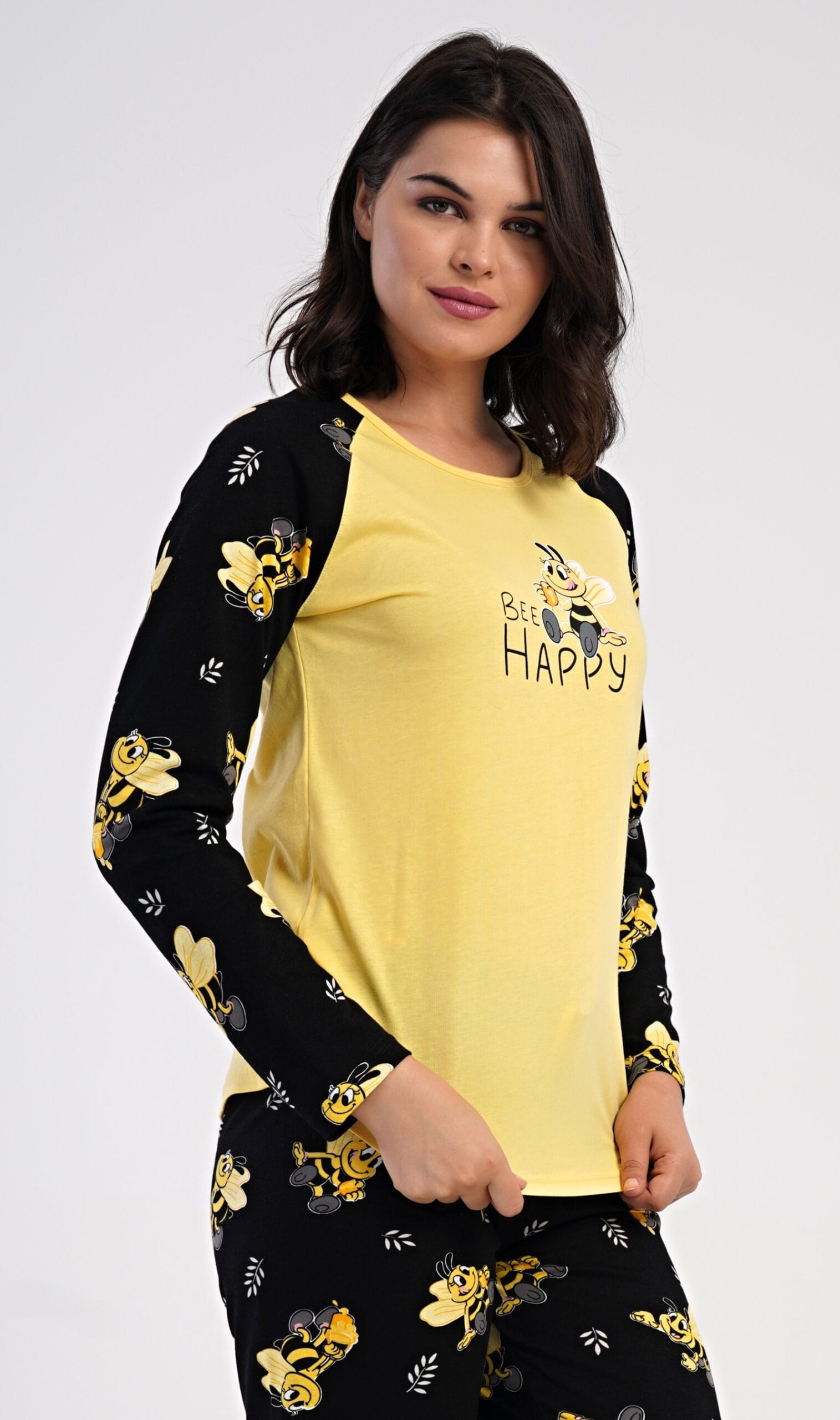 Dámské bavlněné dlouhé pyžamo Včelka. Dámské pyžamo se skládá z trika s dlouhým rukávem a dlouhých kalhot. Triko s kulatým výstřihem je na hrudi zdobeno obrázkem včelky. Tento motiv se opakuje i na kalhotách, které mají v pase gumu a šňůrku na stažení, nemají kapsy. Použitý bavlněný materiál je poddajný a příjemný na dotek. Pokyny pro údržbu:- 100% bavlna- lze prát v pračce při teplotě do 30°- nesušit v sušičce- žehlit z rubu do 110°- nepoužívat bělící prostředky- nečistit chemickyMíry naměřené na výrobk…