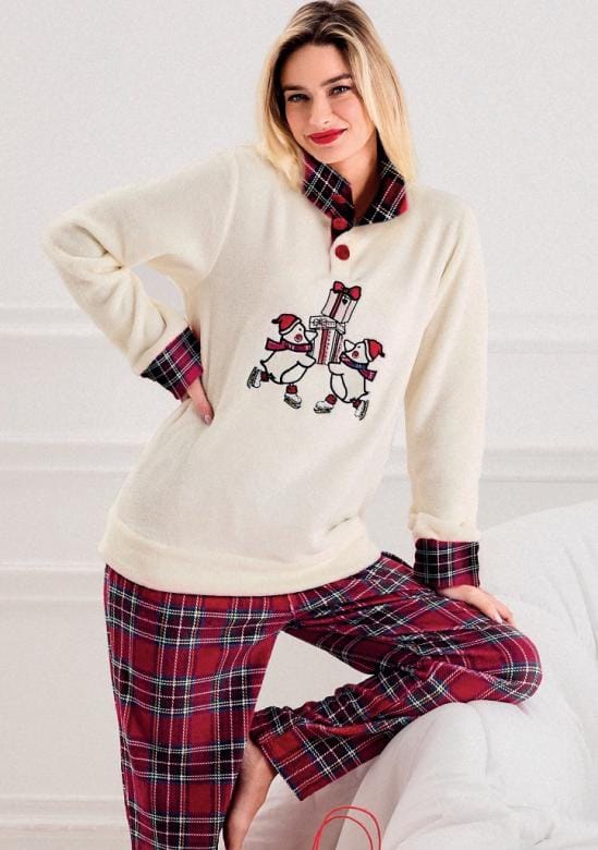 Užijte si zimní večery v maximálním pohodlí s dámským pyžamem, které je součástí oblíbené vánoční kolekce. Tento model je vyroben z extrémně hebkého a teplého coral fleece materiálu, díky kterému je ideální pro chladné dny i dlouhé zimní noci. Pyžamo je ušité ze 100% polyesterového coral fleecu, který je sametově jemný, neelektrizuje a perfektně drží teplo. Pocitově připomíná hebký plyš — ideální pro ženy, které milují maximální komfort. Model zdobí hravý vánoční motiv na vrchním dílu a stylové zimní vzo…