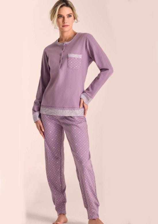 dámské bavlněné pyžamo italské značky Infiore. Pyžamo je ze 100% bavlny, je velmi příjemé a pohodlné. Vrchní díl má kulatý výstřih a légu se čtyřmi knoflíky. Rukávy a spodní díl jsou ukončené úplety. Na přední straně je natištěná kapsička. Vzorované kalhoty jsou do pružné pohodlné gumy.