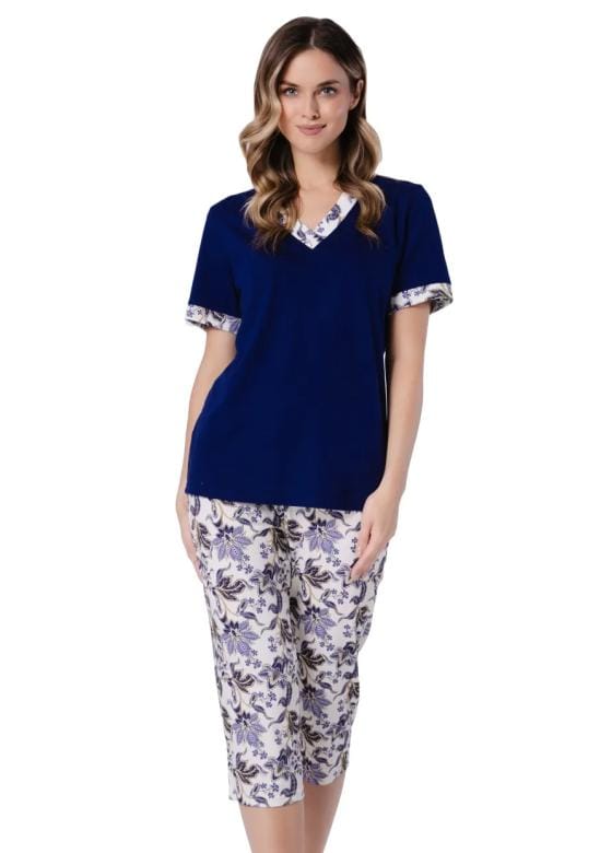 Dámské pyžamo Izabela 1738 značky LEVEZA je dokonalou volbou pro ženy, které si potrpí na pohodlí a vkusný vzhled i během odpočinku. Horní díl s elegantním véčkovým výstřihem v tmavě modré barvě působí decentně, zatímco krátké rukávy s květinovým lemem dodávají jemný ženský akcent. Capri kalhoty se vzorem ladícím k detailům topu vytvářejí harmonický celek a zajišťují maximální komfort při nošení. Lehký materiál ze 100% bavlny příjemně dýchá a poskytuje pocit lehkosti po celou noc i během klidných domácíc…