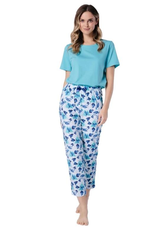 dámské pyžamo Jana 1741 značky LEVEZA představuje spojení pohodlí a elegance, které ocení každá žena při odpočinku i spánku. Horní díl v osvěžující tyrkysové barvě s krátkým rukávem a kulatým výstřihem působí lehce a vzdušně, zatímco volný střih zajišťuje maximální komfort po celý den. Spodní díl je zdobený jemným květinovým vzorem v modrých a zelených tónech na bílém podkladu, což dodává celému setu sofistikovaný vzhled. Elastický pas kalhot se přizpůsobí Vaší postavě bez omezení pohybu. Materiál ze 100…