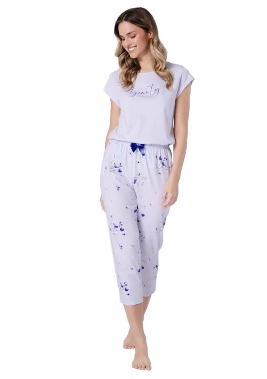 Dámské pyžamo Kajra 1734 značky LEVEZA představuje dokonalou volbu pro ženy, které hledají spojení elegance a pohodlí během odpočinku. Horní díl s krátkým rukávem v jemném světlém odstínu zdobí decentní nápis ve stylovém písmu, což podtrhuje jeho nenucený vzhled. Kalhoty v délce ke kotníkům jsou navrženy s jemným květinovým motivem v modrých tónech na bílém podkladu a elastickým pasem doplněným mašličkou – to vše přináší pocit lehkosti i ženskosti. Lehký materiál ze 100% bavlny je příjemný na dotek, zaji…
