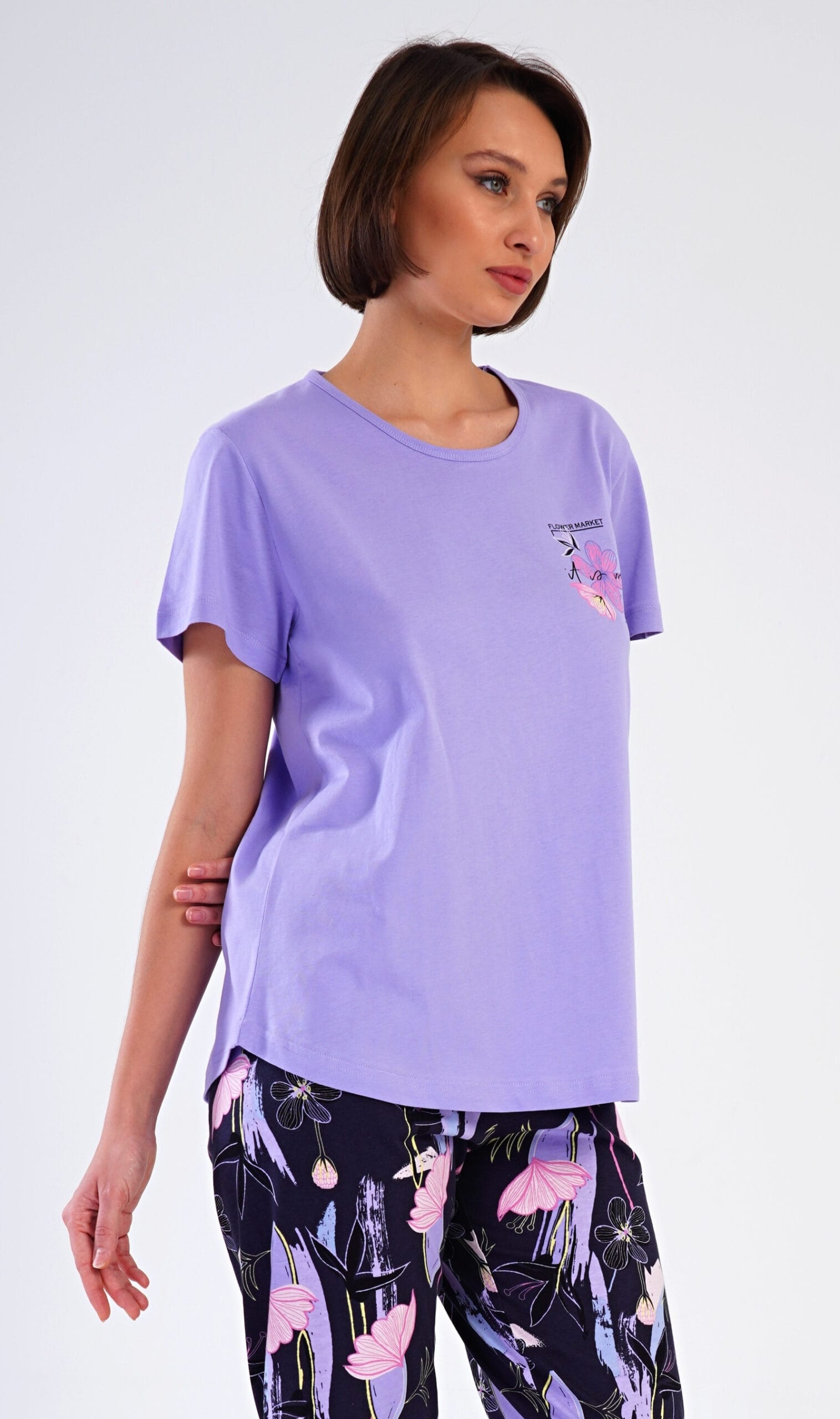 Dámské pyžamo se skládá z trička s krátkým rukávem a tříčtvrtečních kalhot.