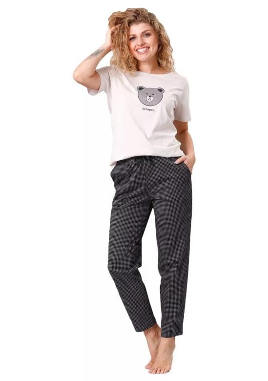 Dámské pyžamo Fran 1190 LEVEZA nabízí kombinaci pohodlí a stylu pro každou ženu, která hledá kvalitní noční prádlo. Tričko je jednobarevné s jemným obrázkem medvěda a nápisem be happy, ideální pro příjemné večery doma. Kalhoty mají dlouhý střih a jsou vzorované, což dodává celému kompletu zajímavý vzhled. Jsou vybaveny praktickými kapsami a měkkou, volnou gumou v pase, která zajišťuje komfort při nošení.
