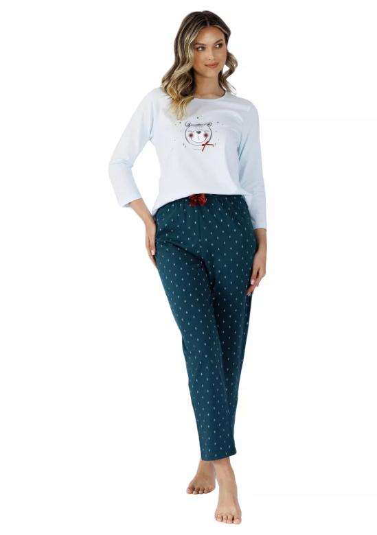 Dámské pyžamo Nida 1477 značky LEVEZA přináší radost do každého večera díky svému elegantnímu a hravému designu. Horní díl v jemném světlém odstínu zdobí půvabný motiv medvídka, který navozuje pocit pohody a uvolnění. Tříčtvrteční rukávy poskytují příjemnou volnost pohybu, zatímco kulatý výstřih podtrhuje ženskou siluetu s lehkostí. Spodní díl v hluboké petrolejové barvě s decentním puntíkovaným vzorem krásně kontrastuje se světlým topem a dotváří harmonický celek. Pohodlný střih kalhot doplňuje ozdobná …