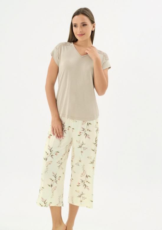 dámské viskózové pyžamo je ideální volbou pro pohodlný spánek i domácí relaxaci. Příjemný a prodyšný materiál z viskózy je jemný na dotek a zajišťuje maximální komfort po celou noc. Horní díl tvoří tričko s krátkým rukávem, který je zakončen výraznějším lemem. Ramena zdobí jemná krajka, která dodává celému modelu ženský a elegantní vzhled. Kalhoty v praktické 7/8 délce mají pohodlný střih a pružný pas do gumy, díky čemuž se skvěle přizpůsobí postavě a neomezují v pohybu. stylové a zároveň pohodlné pyžamo…