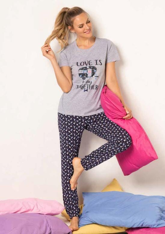 dámské pyžamo značky Siélei v pohodlném a hravém provedení je ideální volbou pro klidný spánek i relaxaci doma. Horní díl tvoří šedé tričko s krátkým rukávem a kulatým výstřihem, které zdobí potisk s nápisem „Love is to stay together“ a romantickým motivem. Spodní díl tvoří dlouhé tmavě modré nebo růžové kalhoty s jemným celoplošným vzorem, které mají pohodlný střih a příjemně se nosí. Měkký a lehký materiál je velmi příjemný na dotek a zajišťuje maximální komfort během celé noci. Toto pyžamo je skvělou …