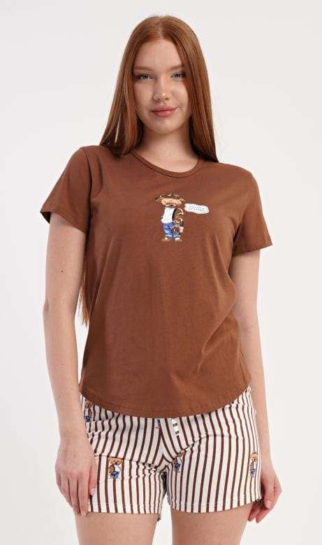 Dámské bavlněné šortkové pyžamo Bear. Dámské pyžamo se skládá z trička s krátkým rukávem a šortkových kalhot. Jednobarevné tričko zdobí obrázek medvídka. Tento motiv se opakuje i na proužkovaných šortkách, které mají v pase gumu a šňůrku na stáhnutí, jsou bez kapes. Použitý bavlněný materiál je příjemný a poddajný na dotek. 5080167715 BearSMLXLobvod hrudníku9296100102délka trika63636464pas70-8274-8676-8880