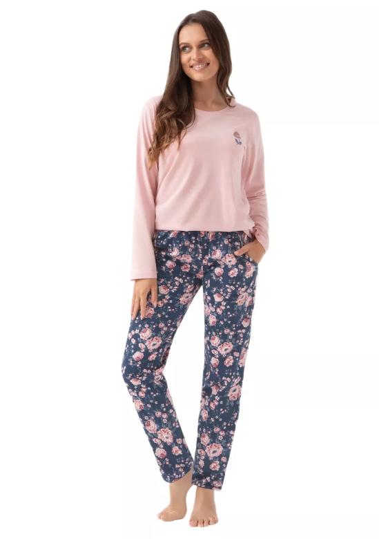 Dámské pyžamo 318/51 značky LUNA představuje spojení elegance a pohodlí, které si zamilujete při každém večerním odpočinku. Horní díl v jemné růžové barvě s kulatým výstřihem a decentním obrázkovým motivem na hrudi působí svěže a žensky. Dlouhé kalhoty v tmavě modrém provedení zdobí květinový vzor, který přináší do Vašeho šatníku lehkost a špetku originality. Díky volnému střihu a praktickým kapsám si užijete maximální komfort, ať už relaxujete doma nebo se chystáte ke spánku.