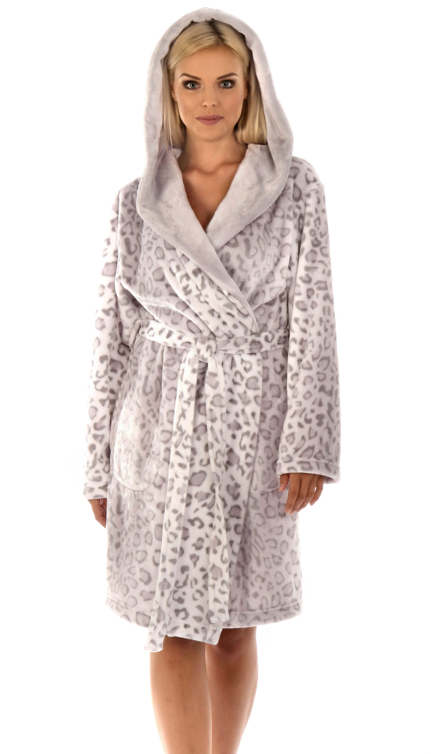 Dámský župan se nabízí ve světle šedém základu s leopardím límcem nebo obrácená varianta s šedým límcem na leopardím základu.