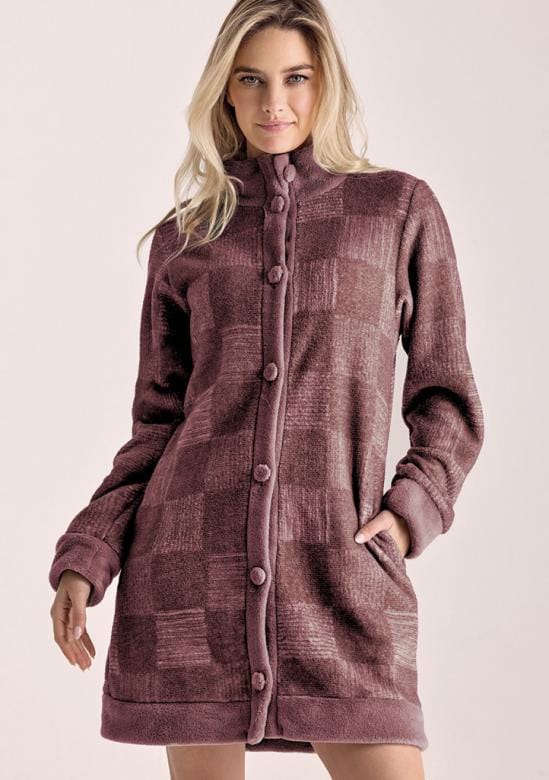 Dámský hřejivý župan Infiore v příjemném odstínu starorůžové je ideální na chladnější dny i večery. Je vyroben z velmi měkkého a hebkého materiálu, který zajišťuje maximální pohodlí. Má elegantní vysoký stojáček, výrazné knoflíky potažené látkou a praktické postranní kapsy. Jemný geometrický vzor dodává županu moderní vzhled. Skvělá volba pro domácí pohodu i jako stylový zimní kousek.