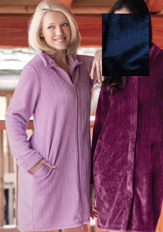 Elegantní dámský župan Siélei v tmavě modré barvě je vyroben z mimořádně hebkého a hřejivého materiálu s jemným sametovým leskem. Má praktický zip po celé délce, stojáček a pohodlné kapsy po stranách. Župan je ideální pro chladné dny – skvěle zahřeje a zároveň působí velmi elegantně.