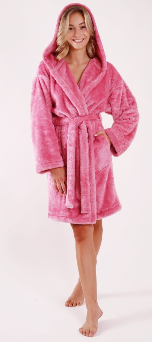 Pohodlný dámský župan s kapucí má dvě kapsy a uprostřed pásek na zavazování.