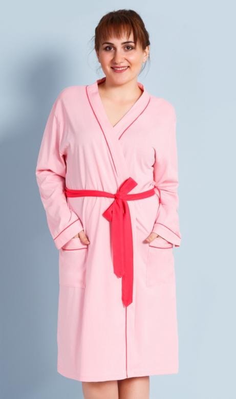 Dámský župan je s dlouhým rukávem, výstřih je olemován barevnou stužkou a zavazuje se na barevný pásek.