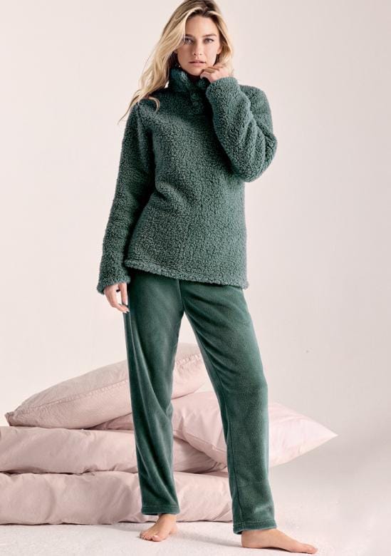 dámské domácí pyžamo Infiore z mimořádně hřejivého a měkkého „teddy“ materiálu, který poskytuje maximální pohodlí v chladných dnech. Vrchní díl má vyšší stojáček na zapínání a nadýchanou, hebkou strukturu, která je příjemná na dotek. kalhoty jsou z jemného mikrovlákna, pohodlné, pružné a s volnějším střihem pro dokonalý komfort při odpočinku. Celý komplet působí útulně, měkce a je ideální na doma, relax i zimní večery. Dostupný v krásných tlumených odstínech.